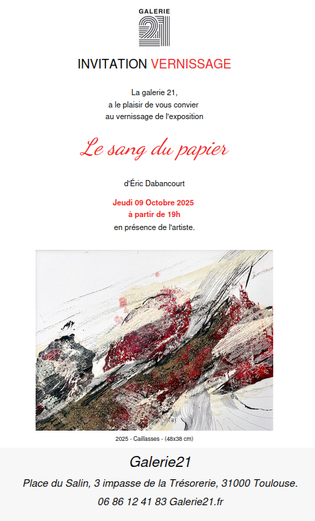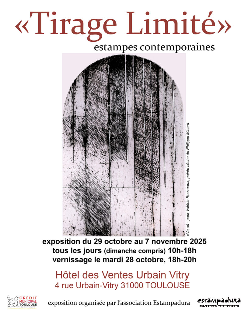 Expositions Toulouse, du 29 octobre au 7 novembre 2025 Périgueux (24000) du 9 au 31 octobre 2025 Toulouse, du 2 au 31 octobre 2025 Cassagne (31260) 27 & 28 septembre 2025 - tel 06.24.10.27.74 Montauban du 2 juillet au 2 août 2025 Cassagne (31260) 24 & 25 mai 2025 Toulouse, du 23 au 25 mai 2025 Cassagne (31260) 24 & 25 mai 2025 Toulouse, du 23 au 25 mai 2025 La Junquière (09130) du 1er au 18 mai 2025 Arras-en-Lavedan (65400), du 15 février au 23 mars 2025 Peyriac-de-Mer (11440), du 14 février au 4 avril 2025 Saint-Girons (09200), du 2 au 31 décembre 2024 Villeneuve-Tolosane, du 20 novembre 2024 au 25 janvier 2025 Aurignac (31420) du 2 novembre au 31 décembre 2024 Esquièze-Sére (65120) du 20 septembre 2024 au 18 janvier 2025 Toulouse, 27-29 septembre 2024 Boussan (31420) du 3 août au 27 octobre 2024 Villeneuve-Tolosane (31270) du 11 septembre au 31 octobre 2024 Pamiers (09100) du 14 septembre au 5 octobre 2024 Toulouse, 31 mai et 1er juin Toulouse, dans le cadre de la Fête de l’Estampe Cassagne (31260) dans le cadre de la Fête de l'Estampe Partout en France autour du 26 mai 2024, et même à Toulouse, Villeneuve-Tolosane et Cassagne 13 artistes d’ESTAMPADURA à Toulouse du 22 avril au 5 mai 2024 Jacques Muron à Toulouse du 15 mars au 13 avril 2024 Charles Giulioli à Pibrac du 31 janvier au 16 février 2024 Catherine Escudié à Lisle-sur-Tarn du 3 février au 3 juin 2024 Laure Bellion à Auch du 28 novembre au 8 janvier Exposition au Majorat de Villeneuve-Tolosane (31270) du 20 septembre au 18 novembre 2023 Exposition à la galerie L'Etang d'Art à Bages (11 100) du 29 juillet au 17 septembre Exposition à la galerie LATUVU à Bages(11 100) du 1er septembre au 1er octobre « Composer avec le réel » = 2 expositions + 14 artistes– du 13 mars au 14 avril 2023à l’ ENSAV Ecole Nationale Supérieure de l’Audovisuel56, rue du Taur TOULOUSE– du 3 mai au 1er juilletà la Chapelle des Cordeliers13, rue des lois Toulouse
